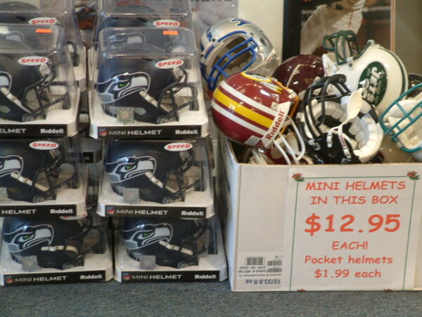 New in package Seahawks mini helmets $24.95 each. Used mini helmets mixed teams $12.95 each.