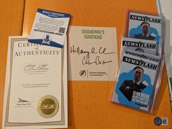 Great gift idea for friends on the political left or right! Hillary and Chelsea Clinton dual signed book BGS certified $59.95! Elon Musk buys Twitter card $14.95!