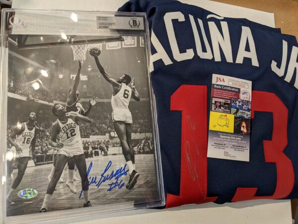Ronald Acuna signed jersey. No logos but autograph certified by BGS $149.95. Bill Russell signed and BGS slabbed photo $299.95 SOLD!