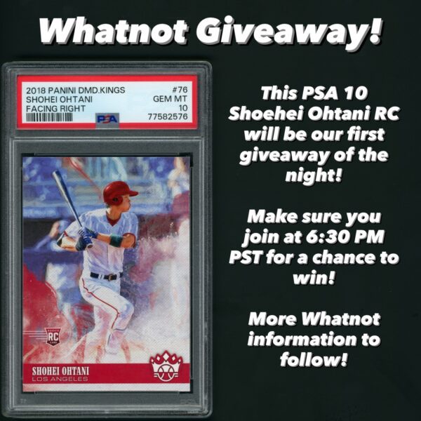 Here’s a small sneak peak at tonight’s Whatnot show! Make sure to join right at 6:30 PM for a chance to win our Shohei Ohtani PSA 10 Rookie for FREE! Username: djssportscards1988