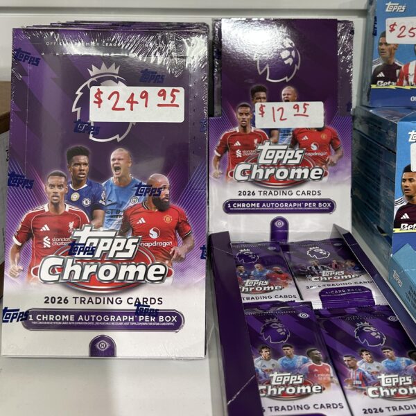 New 2026 Topps Chrome Premier League Soccer Hobby Boxes now available at $249.95 per box, and $12.95 per pack!